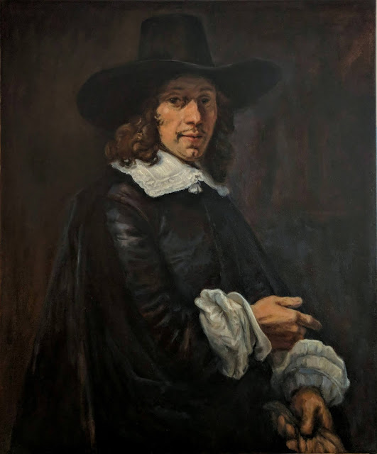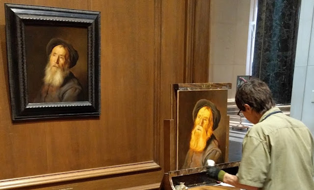 I'm three sessions into the Rembrandt, and the work is coming together. It's a difficult painting to work from even in person, because the dark parts are very dark. It's not due to old varnish, this painting had a complete conservation in 2007; but the contours in the drapery have darkened to near-imperceptibility. My guess is that Rembrandt used lead white as a lightener to describe the folds, and that has now darkened and become nearly as black as the areas around it. The high-res image on the NGA website is actually much better, because it was taken under very bright light which reveals more of the contrast than can be seen in person. Another very interesting fact about this painting is that it was transferred from one canvas to another (not relined, actually transferred) by a Russian conservationist during the 1800's. It wouldn't seem even possible, and is not a method that modern conservation would employ (since all modern conservation measures MUST be reversible), but it was commonly done then. Here is a link about the process to transfer a painting from one support to another, among the riskiest procedures ever used. Here's a link to the technical notes about this specific painting.
