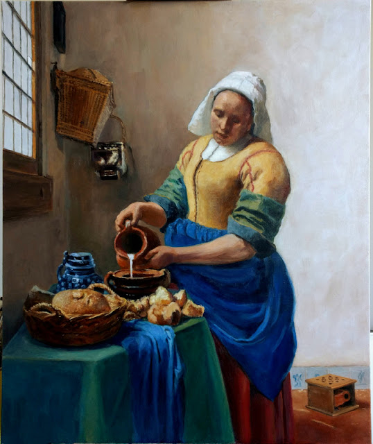 The Vermeer is a huge challenge, especially because I can't work from the original which is in the Netherlands. So, I requested a high-resolution image and information from the Rijksmuseum, which they very kindly sent. This link is a wealth of information about this painting, Vermeer's masterwork, which is full of symbolism and sublime beauty. When I took it on, I didn't realize how much difference it would make that I couldn't see the actual work. The authoritative image is only as good as the monitor with which one views it, so I loaded it onto several computers and tried to sort of "average" the color interpretation.