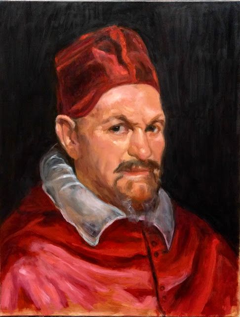 I am using only an earth palette. Although I brought chromatic primaries with me, I didn't touch them. The "blue" eyes are painted with black and white, which is almost certainly what Lievens did. In isolation the color is grey, but in the warm context of the skin, they look very blue. Other than that, I'm using yellow ochre or raw sienna, earth red, burnt sienna and burnt umber. As for painting medium, I would love to use Venice turp which would give a lot more traction especially for the thicker passages of the skin, but real turpentine is not allowed in the NGA because of the stronger smell. Walnut alkyd medium works great for the glazing, adding translucency and a hint of tack and traction.Walnut oil is a nod to the original, since these masters were thought to use walnut rather than linseed. The alkyd helps it dry much more quickly than walnut or even stand oil would, alone.